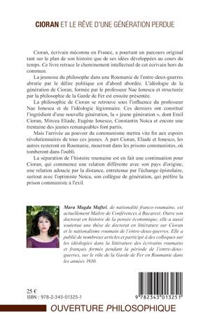 Ecrivain méconnu en France, Cioran a un parcours original tant sur le plan de son histoire que de ses idées. Ce livre retrace le cheminement intellectuel de cet écrivain hors du commun. La jeunesse du philosophe dans une Roumanie de l'entre-deux-guerres abrutie par le délire politique est d'abord abordée. L'idéologie de la génération de Cioran est ensuite présentée, ses liens avec Mircea Eliade, Eugene Ionesco, Constantin Noica.
