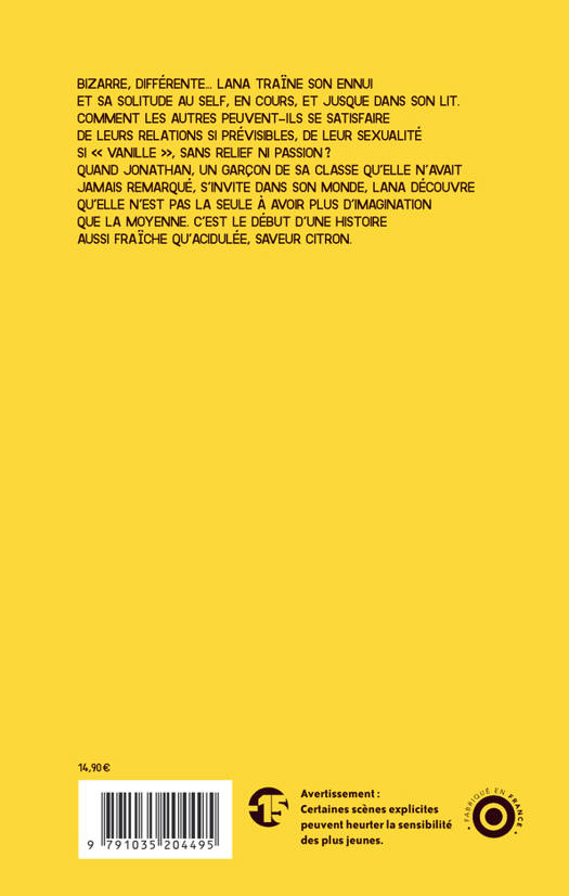 Bizarre, différente... Lana traîne son ennui et sa solitude au self, en cours, et jusque dans son lit. Comment les autres peuvent- ils se satisfaire de leurs relations si prévisibles, de leur sexualité si « vanille », sans relief ni passion ? Quand Jonathan, un garçon de sa classe qu'elle n'avait jamais remarqué, s'invite dans son monde, Lana découvre qu'elle n'est pas la seule à avoir plus d'imagination que la moyenne. C'est le début d'une histoire aussi fraîche qu'acidulée, saveur citron.
