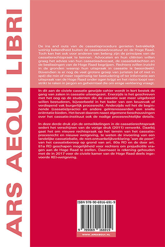 In deze derde druk zijn de ontwikkelingen in de cassatierechtspraak sedert het verschijnen van de vorige druk (2011) verwerkt. Daarbij gaat het om nieuwe rechtspraak op het terrein van het cassatieprocesrecht en nieuwe wetgeving, te weten de invoering van een landelijke cassatiebalie, de niet-ontvankelijkverklaring 'aan de poort' van het cassatieberoep op grond van art. 80a RO en de door art. 81a RO geschapen mogelijkheid voor rechters om prejudiciële vragen aan de Hoge Raad te stellen. Daarnaast is rekening gehouden met de in 2017 voor de civiele kamer van de Hoge Raad deels ingevoerde KEI-wetgeving.