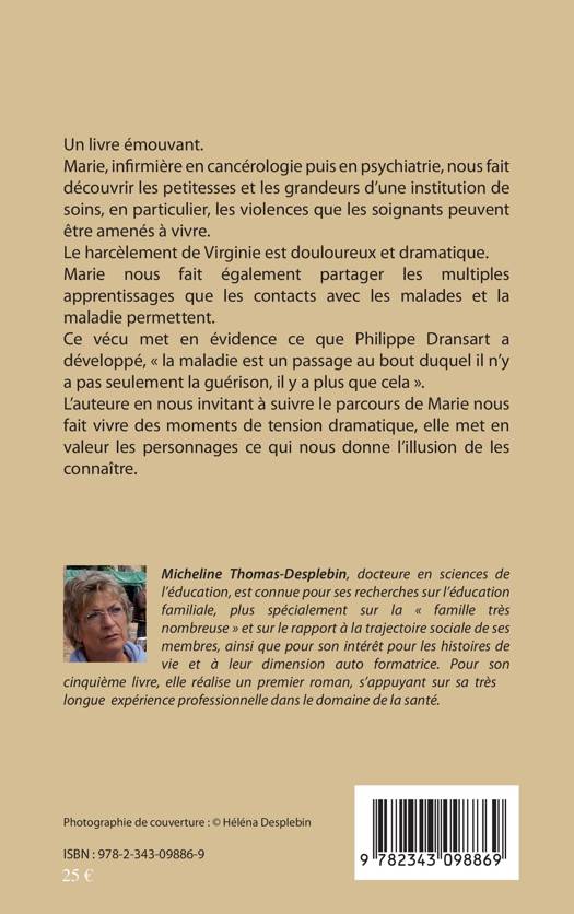 Marie, infirmière en cancérologie puis en psychiatrie, nous fait découvrir les petitesses et les grandeurs d'une institution de soins, en particulier, les violences que les soignants peuvent être amenés à vivre. Le harcèlement de Virginie est douloureux et dramatique. Marie nous fait également partager les multiples apprentissages que les contacts avec les malades et la maladie permettent. Ce vécu met en évidence ce que Philippe Dransart a développé, « la maladie est un passage au bout duquel il n'y a pas seulement la guérison, il y a plus que cela ». L'auteure en nous invitant à suivre le parcours de Marie nous fait vivre des moments de tension dramatique, elle met en valeur les personnages ce qui nous donne l'illusion de les connaître.
