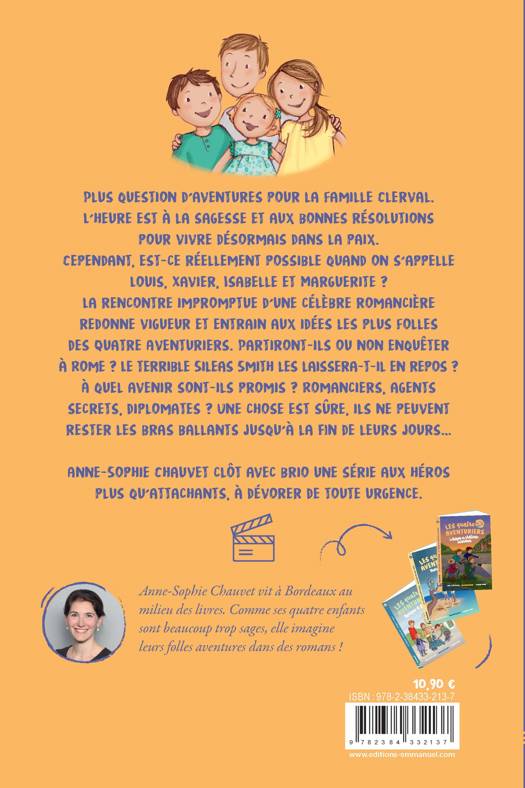 Plus question d’aventures pour la famille Clerval. L’heure est à la sagesse et aux bonnes résolutions pour vivre désormais dans la paix. Cependant, estce réellement possible quand on s’appelle Louis, Xavier, Isabelle et Marguerite ? La rencontre impromptue d’une célèbre romancière redonne vigueur et entrain aux idées les plus folles des Quatre Aventuriers. Partiront-ils ou non enquêter à Rome ? Le terrible Sileas Smith les laissera-t-il en repos ? À quel avenir sont-ils promis ? Romanciers, agents secrets, diplomates ? Une chose est sûre, ils ne peuvent rester les bras ballants jusqu’à la fin de leurs jours… Anne-Sophie Chauvet clôt avec brio une série aux héros plus qu’attachants, à dévorer de toute urgence.