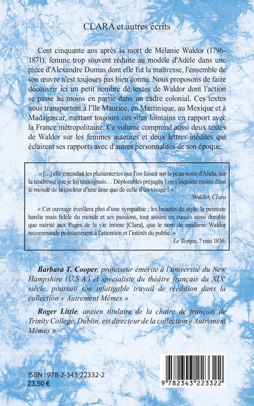 Cent cinquante ans après la mort de Mélanie Waldor (1796- 1871), femme trop souvent réduite au modèle d'Adèle dans une pièce d'Alexandre Dumas dont elle fut la maîtresse, l'ensemble de son oeuvre n'est toujours pas bien connu. Nous proposons de faire découvrir ici un petit nombre de textes de Waldor dont l'action se passe au moins en partie dans un cadre colonial. Ces textes nous transportent à l'île Maurice, en Martinique, au Mexique et à Madagascar, mettant toujours ces sites lointains en rapport avec la France métropolitaine. Ce volume comprend aussi deux textes de Waldor sur les femmes auteures et deux lettres inédites qui éclairent ses rapports avec d'autres personnalités de son époque.