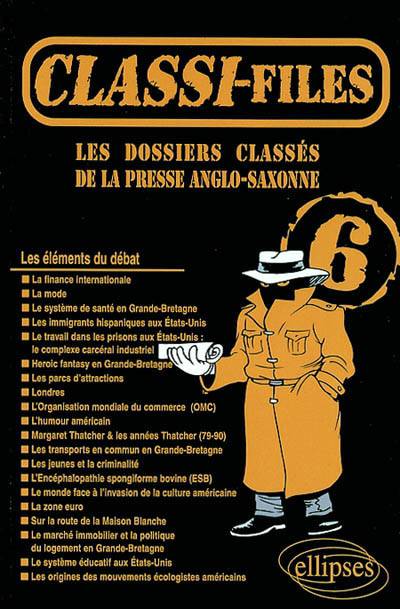 • La finance internationale • La mode • Le système de santé en Grande-Bretagne • Les immigrants hispaniques aux Etats-Unis • Le travail dans les prisons aux Etats-Unis : le complexe carcéral industriel • Heroic Fantasy en Grande-Bretagne • Les parcs d'attractions • Londres • L'Organisation mondiale du commerce (OMC) • L'humour américain • Margaret Thatcher et les années Thatcher (1979-1990) • Les transports en commun en Grande-Bretagne • Les jeunes et la criminalité • L'Encéphalopathie spongiforme bovine (ESB) • Le monde face à l'invasion de la culture américaine • La zone euro • Sur la route de la Maison Blanche • Le marché immobilier et la politique du logement en Grande-Bretagne • Le système éducatif aux Etats-Unis • Les origines des mouvements écologistes américains.