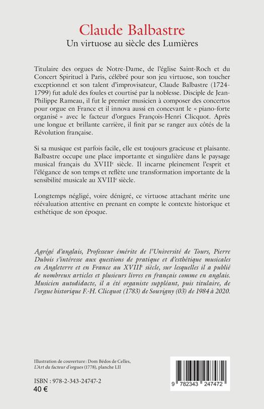 Titulaire des orgues de Notre-Dame, de l’église Saint-Roch et du Concert Spirituel à Paris, célébré pour son jeu virtuose, son toucher exceptionnel et son talent d’improvisateur, Claude Balbastre (1724-1799) fut adulé des foules et courtisé par la noblesse. Disciple de Jean-Philippe Rameau, il fut le premier musicien à composer des concertos pour orgue en France et il innova aussi en concevant le « piano forte organisé » avec le facteur d’orgues François-Henri Clicquot. Balbastre occupe une place importante et singulière dans le paysage musical français du XVIIIe siècle. Il incarne pleinement l’esprit et l’élégance de son temps et reflète une transformation importante de la sensibilité musicale au XVIIIe siècle. Longtemps négligé, voire dénigré, ce virtuose attachant mérite une réévaluation attentive en prenant en compte le contexte historique et esthétique de son époque.