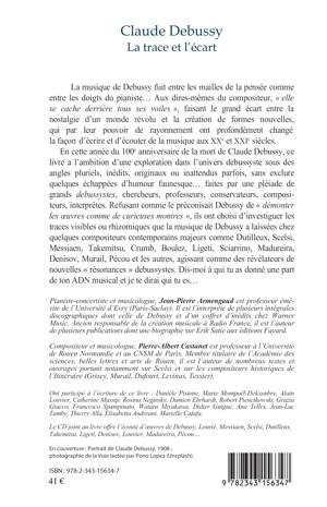 En cette année du 100e anniversaire de la mort de Claude Debussy, ce livre accompagné de deux CD a l'ambition d'une exploration dans l'univers debussyste sous des angles pluriels, inédits, originaux ou inattendus parfois, sans exclure quelques échappées d'humour faunesque… faites par une pléiade de grands debussystes, chercheurs, professeurs, compositeurs, interprètes. Refusant comme le préconisait Debussy de « démonter les oeuvres comme de curieuses montres », ils ont choisi d'investiguer les traces que la musique de Debussy a laissées chez quelques compositeurs contemporains majeurs.