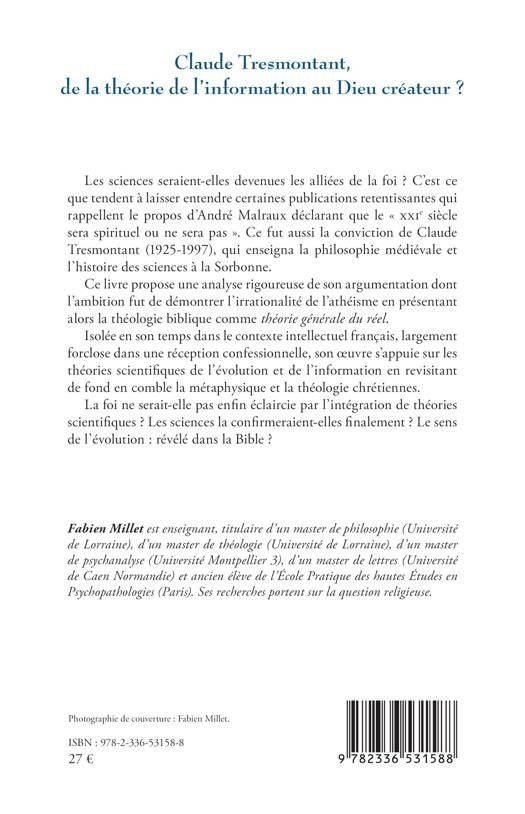 Les sciences seraient-elles devenues les alliées de la foi ? C'est ce que tendent à laisser entendre certaines publications retentissantes qui rappellent le propos d'André Malraux déclarant que le XXIe siècle sera spirituel ou ne sera pas . Ce fut aussi la conviction de Claude Tresmontant (1925-1997), qui enseigna la philosophie médiévale et l'histoire des sciences à la Sorbonne. Ce livre propose une analyse rigoureuse de son argumentation dont l'ambition fut de démontrer l'irrationalité de l'athéisme en présentant alors la théologie biblique comme théorie générale du réel. Isolée en son temps dans le contexte intellectuel français, largement forclose dans une réception confessionnelle, son oeuvre s'appuie sur les théories scientifiques de l'évolution et de l'information en revisitant de fond en comble la métaphysique et la théologie chrétiennes. La foi ne serait-elle pas enfin éclaircie par l'intégration de théories scientifiques ? Les sciences la confirmeraient-elles finalement ? Le sens de l'évolution: révélé dans la Bible ?