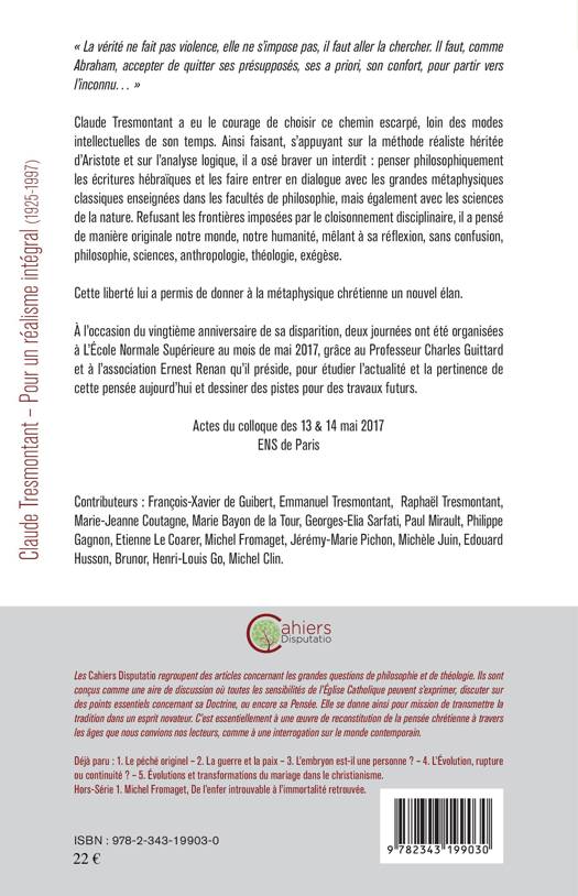 Claude Tresmontant a eu le courage de choisir un chemin escarpé, loin des modes intellectuelles de son temps. S'appuyant sur la méthode réaliste héritée d'Aristote et sur l'analyse logique, il a osé braver un interdit : penser philosophiquement les écritures hébraïques et les faire entrer en dialogue avec les grandes métaphysiques classiques enseignées dans les facultés de philosophie, mais également avec les sciences de la nature. Refusant les frontières disciplinaires, il a pensé de manière originale notre monde, notre humanité, mêlant à sa réflexion philosophie, sciences, anthropologie, théologie et exégèse. Cette liberté lui a permis de donner à la métaphysique chrétienne un nouvel élan.