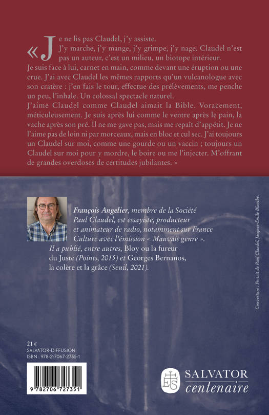 Je ne lis pas Claudel, j'y assiste. J'y marche, j'y mange, j'y grimpe, j'y nage. Claudel n'est pas un auteur, c'est un milieu, un biotope intérieur. Je suis face à lui, carnet en main, comme devant une éruption ou une crue. J'ai avec Claudel les mêmes rapports qu'un vulcanologue avec son cratère : j'en fais le tour, effectue des prélèvements, me penche un peu, l'inhale. Un colossal spectacle naturel. J'aime Claudel comme Claudel aimait la Bible. Voracement, méticuleusement. Je suis après lui comme le ventre après le pain, la vache après son pré. Il ne me gave pas, mais me repaît d'appétit. Je ne l'aime pas de loin ni par morceaux, mais en bloc et cul sec. J'ai toujours un Claudel sur moi, comme une gourde ou un vaccin , toujours un Claudel sur moi pour y mordre, le boire ou me l'injecter. M'offrant de grandes overdoses de certitudes jubilantes. » François Angelier, membre de la Société Paul Claudel, est essayiste, producteur et animateur de radio. Il a publié, Bloy ou la fureur du just
