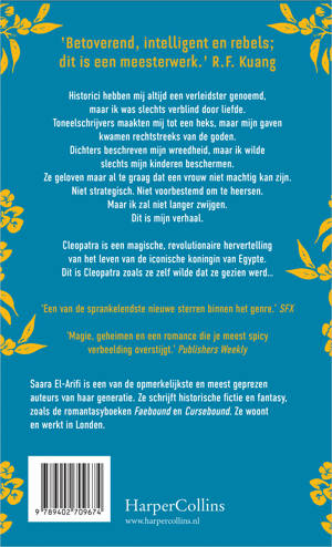 Cleopatra van Saara El-Arifi is een epische hervertelling meets romantasy van de auteur van Faebound. 'Historici hebben mij altijd een verleidster genoemd, maar ik was slechts verblind door liefde. Toneelschrijvers maakten mij tot een heks, maar mijn gaven kwamen rechtstreeks van de goden. Dichters beschreven mijn wreedheid, maar ik wilde slechts mijn kinderen beschermen. Ze geloven maar al te graag dat een vrouw niet machtig kan zijn. Niet strategisch. Niet voorbestemd om te heersen. Maar ik zal niet langer zwijgen. Dit is míjn verhaal.' Cleopatra is een magische, revolutionaire hervertelling van het leven van de iconische koningin van Egypte. Dit is Cleopatra zoals ze zelf wilde dat ze gezien werd… 'Betoverend, intelligent en rebels; dit is een meesterwerk.' R.F. Kuang, auteur van Babel en Yellowface 'Wat een rijke, beeldende stijl.' The Bookseller 'Magie, geheimen en een romance die je stoutste verbeelding overstijgt... Een regelrechte voltreffer.' Publishers Weekly 'Cleopatra is een sensationele historische roman: Cleopatra zoals haar verhaal bedoeld is.' Hanna Kaner, auteur van The Fallen Gods Trilogy