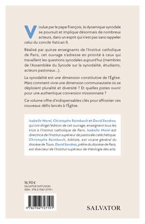 Voulue par le pape François, la dynamique synodale se poursuit et implique désormais de nombreux acteurs, dans un esprit qui n'est pas sans rappeler celui du concile Vatican II. Réalisé par quinze enseignants de l'Institut catholique de Paris, cet ouvrage s'adresse en priorité à ceux qui travaillent les questions synodales aujourd'hui (membres de l'Assemblée du Synode sur la synodalité, étudiants, acteurs pastoraux...). La synodalité est une dimension constitutive de l'Église. Mais comment vivre une dimension communautaire où se déploient pluralité et diversité ? Et quelles pistes ouvrir pour une authentique conversion missionnaire ? Ce volume offre d'indispensables clés pour affronter ces nouveaux défis lancés à l'Église. AUTEUR Isabelle Morel, Christophe Raimbault et David Sendrez, qui ont dirigé l'édition de cet ouvrage, enseignent tous les trois à l'Institut catholique de Paris. Isabelle Morel est directrice de l'Institut supérieur de pastorale catéchétique. Christophe Raimbault, bibliste, est vicaire général du diocèse de Tours. David Sendrez, prêtre du diocèse de Paris, est directeur de l'Institut supérieur de théologie des arts.