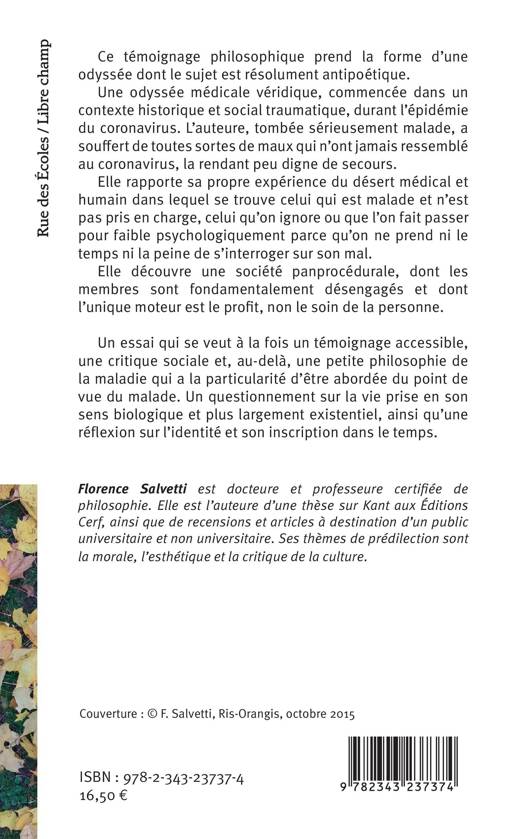 Ce témoignage philosophique prend la forme d'une odyssée dont le sujet est résolument antipoétique. Une odyssée médicale véridique, commencée dans un contexte historique et social traumatique, durant l'épidémie du coronavirus. L'auteure, tombée sérieusement malade, a souffert de toutes sortes de maux qui n'ont jamais ressemblé au coronavirus, la rendant peu digne de secours. Elle rapporte sa propre expérience du désert médical et humain dans lequel se trouve le malade qui n'est pas pris en charge, celui qu'on ignore ou que l'on fait passer pour faible psychologiquement parce qu'on ne prend ni le temps ni la peine de s'interroger sur son mal. Elle découvre une société panprocédurale, dont les membres sont fondamentalement désengagés et dont l'unique moteur est le profit, non le soin de la personne. Cet essai se veut à la fois un témoignage accessible, une critique sociale et, au-delà, une petite philosophie de la maladie abordée du point de vue du malade.