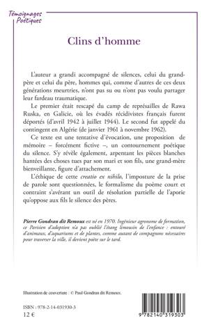 L'auteur a grandi accompagné de silences, celui du grand-père et celui du père, hommes qui, comme d'autres de ces deux générations meurtries, n'ont pas su ou n'ont pas voulu partager leur fardeau traumatique. Le premier était rescapé du camp de représailles de Rawa Ruska, en Galicie, où les évadés récidivistes français furent déportés (d'avril 1942 à juillet 1944). Le second fut appelé du contingent en Algérie (de janvier 1961 à novembre 1962). Ce texte est une tentative d'évocation, une proposition de mémoire - forcément fictive -, un contournement poétique du silence. S'y révèle également, arpentant les pièces blanches hantées des choses tues par son mari et son fils, une grand-mère bienveillante, figure d'attachement. L'éthique de cette creatio ex nihilo, l'imposture de la prise de parole sont questionnées, le formalisme du poème court et contraint s'avérant un outil de résolution partielle de l'aporie qu'oppose aux fils le silence des pères.