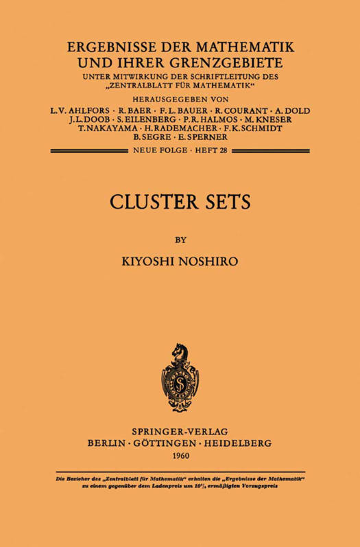 For the first systematic investigations of the theory of cluster sets of analytic functions, we are indebted to IVERSEN [1-3J and GROSS [1-3J about forty years ago. Subsequent important contributions before 1940 were made by SEIDEL [1-2J, DOOE [1-4J, CARTWRIGHT [1-3J and BEURLING [1]. The investigations of SEIDEL and BEURLING gave great impetus and interest to Japanese mathematicians; beginning about 1940 some contributions were made to the theory by KUNUGUI [1-3J, IRIE [IJ, TOKI [IJ, TUMURA [1-2J, KAMETANI [1-4J, TsuJI [4J and NOSHIRO [1-4J. Recently, many noteworthy advances have been made by BAGEMIHL, SEIDEL, COLLINGWOOD, CARTWRIGHT, HERVE, LEHTO, LOHWATER, MEIER, OHTSUKA and many other mathematicians. The main purpose of this small book is to give a systematic account on the theory of cluster sets. Chapter I is devoted to some definitions and preliminary discussions. In Chapter II, we treat extensions of classical results on cluster sets to the case of single-valued analytic functions in a general plane domain whose boundary contains a compact set of essential singularities of capacity zero; it is well-known that HALLSTROM [2J and TsuJI [7J extended independently Nevanlinna's theory of meromorphic functions to the case of a compact set of essential singUlarities of logarithmic capacity zero. Here, Ahlfors' theory of covering surfaces plays a funda- mental role. Chapter III "is concerned with functions meromorphic in the unit circle.