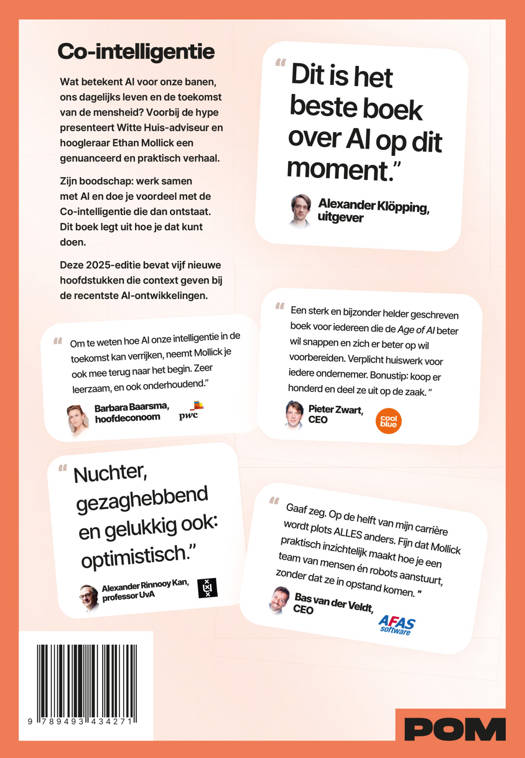 'Co-Intelligentie is een geweldig toegankelijk boek dat je laat zien hoe AI je kan helpen je werk naar een hoger niveau te tillen. Leren werken met AI wordt in rap tempo een essentiële vaardigheid. Als je nog geen start hebt gemaakt met het verkennen van wat AI voor jouw werk kan betekenen, pak dan dit boek.' - Rick Pastoor, Auteur bestseller Grip