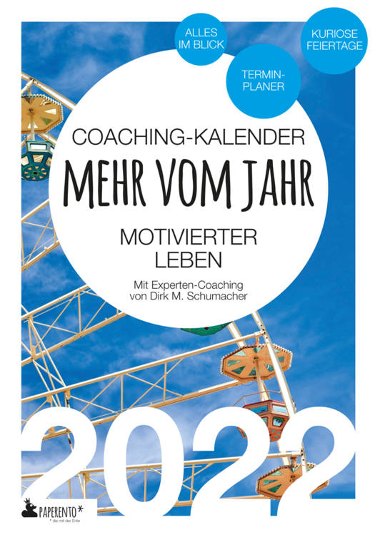 Mit diesem Kalender haben Sie mehr vom Jahr! Machen Sie den ersten großen Schritt in ein motiviertes 2022. Coach Dirk M. Schumacher begleitet Sie als Experte durch 365 Tage. In jedem Wochencoaching gibt er Motivations-Impulse. Nehmen Sie sich bewusst Zeit, schriftlich darauf zu antworten. Denn nur dann haben Sie tatsächlich mehr vom Jahr.Endlich Durchblick: Das übersichtliche Kalenderbuch im Format DIN A5 trägt nicht ohne Grund den Titel "Mehr vom Jahr". Denn es verspricht mehr Zeit fürs Wesentliche. Mit praktischem Leitsystem durch die Monate, einem mitlaufenden Wochenschnellzugriff, dazu Platz für Notizen, Pläne, Ideen, wichtige Kontakte. Als Wochenplaner und Monatsplaner ist das Kalenderbuch ein stetiger Begleiter durchs Jahr. Mit einem Überblick bundesdeutscher Feiertage sowie kuriosen Feiertagen. Von PAPERENTO ... die mit der Ente.