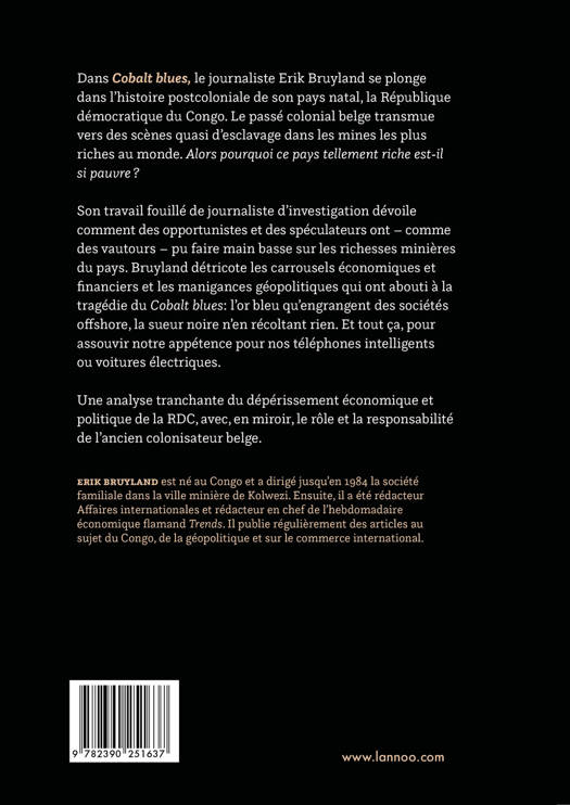 Dans Cobalt blues, le journaliste Erik Bruyland se plonge dans l'histoire postcoloniale de son pays natal, la République démocratique du Congo. Le passé colonial belge transmue vers des scènes quasi d'esclavage dans les mines les plus riches au monde. Alors pourquoi ce pays tellement riche est-il si pauvre ? Son travail fouillé de journaliste d'investigation dévoile comment des opportunistes et des spéculateurs ont - comme des vautours - pu faire main basse sur les richesses minières du pays. Bruyland détricote les carrousels économiques et financiers et les manigances géopolitiques qui ont abouti à la tragédie du Cobalt blues : l'or bleu qu'engrangent des sociétés offshore, la sueur noire n'en récoltant rien. Et tout ça, pour assouvir notre appétence pour nos téléphones intelligents ou voitures électriques. Une analyse tranchante du dépérissement économique et politique de la RDC, avec, en miroir, le rôle et la responsabilité de l'ancien colonisateur belge.