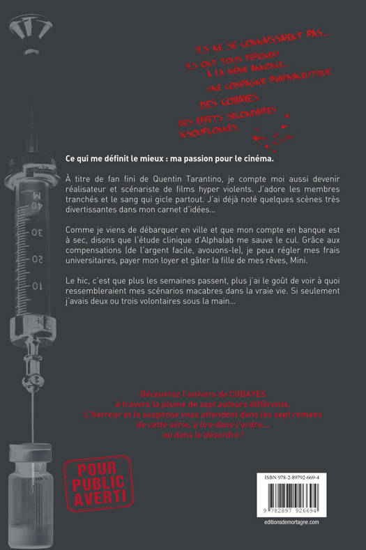 Ce qui me définit le mieux : ma passion pour le cinéma. À titre de fan fini de Quentin Tarantino, je compte moi aussi devenir réalisateur et scénariste de films hyper violents. J'adore les membres tranchés et le sang qui gicle partout. J'ai déjà noté quelques scènes très divertissantes dans mon carnet d'idées... Comme je viens de débarquer en ville et que mon compte en banque est à sec, disons que l'étude clinique d'Alphalab me sauve le cul. Grâce aux compensations (de l'argent facile, avouons-le), je peux régler mes frais universitaires, payer mon loyer et gâter la fille de mes rêves, Mini. Le hic, c'est que plus les semaines passent, plus j'ai le goût de voir à quoi ressembleraient mes scénarios macabres dans la vraie vie. Si seulement j'avais deux ou trois volontaires sous la main...