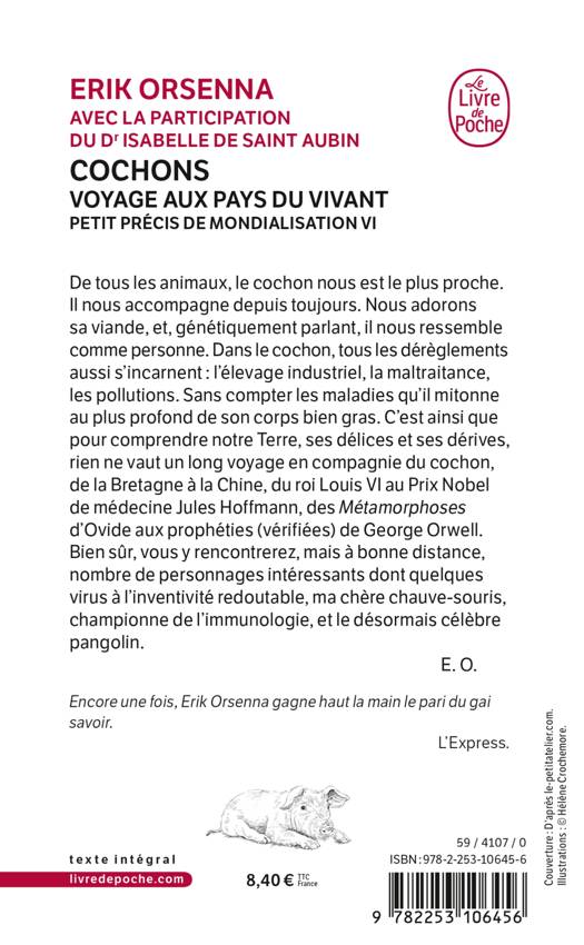 De tous les animaux, le cochon nous est le plus proche. Il nous accompagne depuis toujours. Nous adorons sa viande, et, génétiquement parlant, il nous ressemble comme personne. Dans le cochon, tous les dérèglements aussi s’incarnent : l’élevage industriel, la maltraitance, les pollutions. Sans compter les maladies qu’il mitonne au plus profond de son corps bien gras. C’est ainsi que pour comprendre notre Terre, ses délices et ses dérives, rien ne vaut un long voyage en compagnie du cochon, de la Bretagne à la Chine, du roi Louis VI au Prix Nobel de médecine Jules Hoffmann, des Métamorphoses d’Ovide aux prophéties (vérifiées) de George Orwell. Bien sûr, vous y rencontrerez, mais à bonne distance, nombre de personnages intéressants dont quelques virus à l’inventivité redoutable, ma chère chauve-souris, championne de l’immunologie, et le désormais célèbre pangolin.