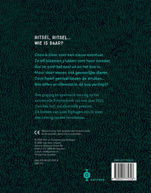 In het vervolg op 'Coco kan het!', het succesvolle Prentenboek van het Jaar 2021, gaat Coco eropuit om bloemen te plukken voor haar moeder. Verderop zien de bloemen er veel mooier uit dan dicht bij haar nest, dus ze gaat steeds verder het bos in. Maar daar wonen ook gevaarlijke dieren... Plotseling hoort Coco geritsel tussen de struiken. Wie is daar? Kijk uit voor die poes, Coco!