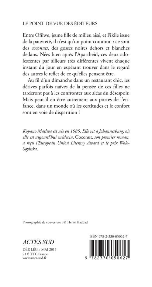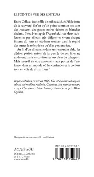 Entre Ofilwe, jeune fille de milieu aisé, et Fikile issue de la pauvreté, il n'est qu'un point commun : ce sont des «coconuts», des gosses noires dehors et blanches dedans. Nées bien après l'Apartheid, ces deux adolescentes par ailleurs très différentes vivent chaque instant du jour en espérant trouver dans le regard des autres le reflet de ce qu'elles pensent être.