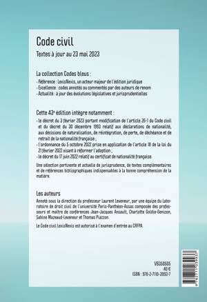 Livre premier - Des personnes Livre deuxième - Des biensLivre troisième - Des différentes manières dont on acquiert la propriété Livre quatrième - Des sûretés Livre cinquième - Disposition applicable à Mayotte Annexes - Textes codifiés Annexes - Textes non codifiés