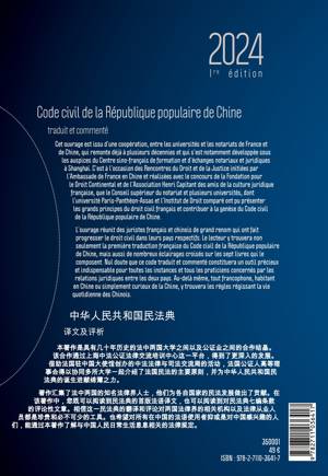 Ce code présente le Code civil chinois adopté par l'Assemblée populaire nationale de Chine le 28 mai 2020. Il se compose de deux parties : d'une part le code dans sa version d'origine et d'autre part sa traduction en français. Chacun des sept livres du Code est précédé de notices rédigées par des auteurs universitaires et praticiens, chinois et français, dans chacune des versions. Le Code a été réalisé sous la direction de Maître Olivier Vix, du Professeur Michel Grimaldi, de la Professeur Marie Goré et du Professeur Charles Gijsbers.