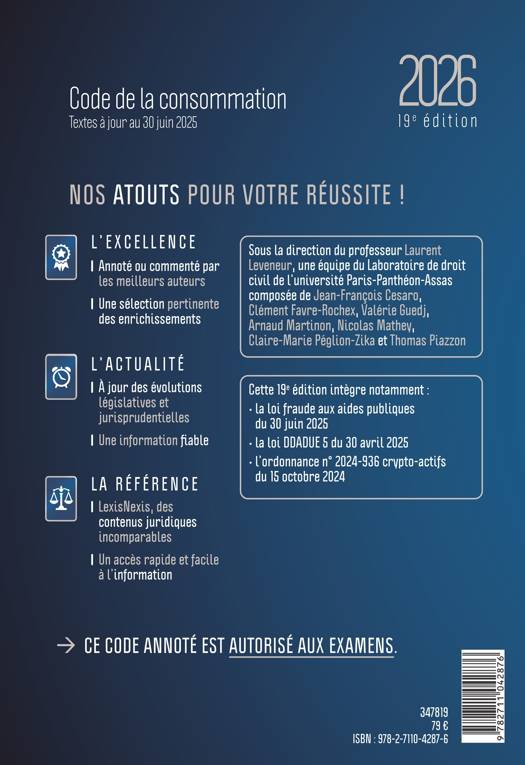 Annoté sous la direction du Professeur Laurent Leveneur, le Code de la consommation est l'outil indispensable à la compréhension du droit de la consommation. Ce code présente le Code de la consommation et rassemble l'ensemble des textes et jurisprudences relatifs aux droits des consommateurs et du crédit à la consommation dans un ouvrage accessible à la fois aux professionnels, aux étudiants, ainsi qu'à tous les consommateurs et à leurs associations. Annoté de nombreuses références bibliographiques et jurisprudentielles récentes, il est complété par près de 20 annexes thématiques et comporte un index précis et détaillé facilitant l'accès à l'information. 1/ Un code complet et fiable : tout le droit de la consommation et du crédit en un seul code (droit interne et de l'Union européenne). 2/ Annoté sous la direction du Professeur Laurent Leveneur, une équipe du laboratoire de droit civil de l'université Paris-Panthéon-Assas. 3/ Pratique, ce code autorisé aux examens facilite l'accès à l'information grâce à près de 20 annexes thématiques et son index détaillé.
