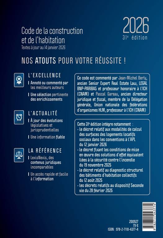 Le Code de la construction et de l'habitation se différencie des autres codes du marché par sa rédaction extrêmement fonctionnelle. Commenté par des professionnels pour des professionnels, il apporte un éclairage pratique et concret de la législation en vigueur en matière de construction et d'habitation. 1/ Fonctionnalité et pragmatisme de l'ouvrage : commentaires pratiques et concrets, illustrés de jurisprudences pertinentes.