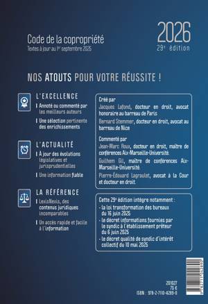 Le Code de la copropriété LexisNexis est la référence en matière de droit de la copropriété. Ce code, créé par Jacques Lafond et Bernard Stemmer, réunit toutes les règles régissant l'organisation et le fonctionnement des copropriétés. Plus de 60 annexes thématiques complètent les deux grands textes fondant la matière. Ce code est l'outil de référence des professionnels (avocats, notaires, syndics de copropriété entre autres) comme des particuliers impliqués dans l'administration ou la gestion d'un immeuble. 1/ Ce code de référence présente les deux principaux textes du droit de la copropriété, commentés et enrichis de jurisprudence. S'y ajoute plus de 60 annexes thématiques. 2/ Jean-Marc Roux, Guilhem Gil et Pierre-Edouard Lagraulet, auteurs reconnus en droit de l'immobilier et de la copropriété, ont sélectionné et commenté les textes et la jurisprudence les plus pertinents. 3/ Pratique : accès facile à l'information grâce à l'index et aux annexes thématiques.