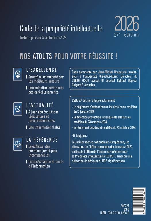 Annoté par le spécialiste de la matière, le Code de la propriété intellectuelle est indispensable aux étudiants et professionnels du droit de la propriété littéraire et artistique et de la propriété industrielle. Destiné aux professionnels comme aux étudiants, le Code de la propriété intellectuelle contient, outre les textes codifiés, les textes nationaux non codifiés ; les textes européens et internationaux ; les textes fiscaux (conventions fiscales auxquelles la France est partie) ; la jurisprudence nationale et européenne ; les décisions de l'Office européen des brevets (OEB) et de l'Office de l'harmonisation dans le marché intérieur (OHMI). C'est l'outil indispensable pour protéger la création intellectuelle. 1/ Le Code de la propriété intellectuelle présente le droit de la propriété intellectuelle sous tous ses aspects (droit d'auteur, droits voisins, propriété industrielle, marques, dessins, modèles, brevets), textes et décisions de justice, en droit national, européen et international. 2/ Jean-Michel Bruguière est directeur du Master Droit de la propriété intellectuelle et des nouvelles technologies à l'université Grenoble Alpes et avocat of counsel. 3/ Pratique : le Code est enrichi de 20 annexes thématiques qui présentent une sélection pertinente de textes et de jurisprudence. L'index facilite la navigation dans le corpus du code et dans les annexes.