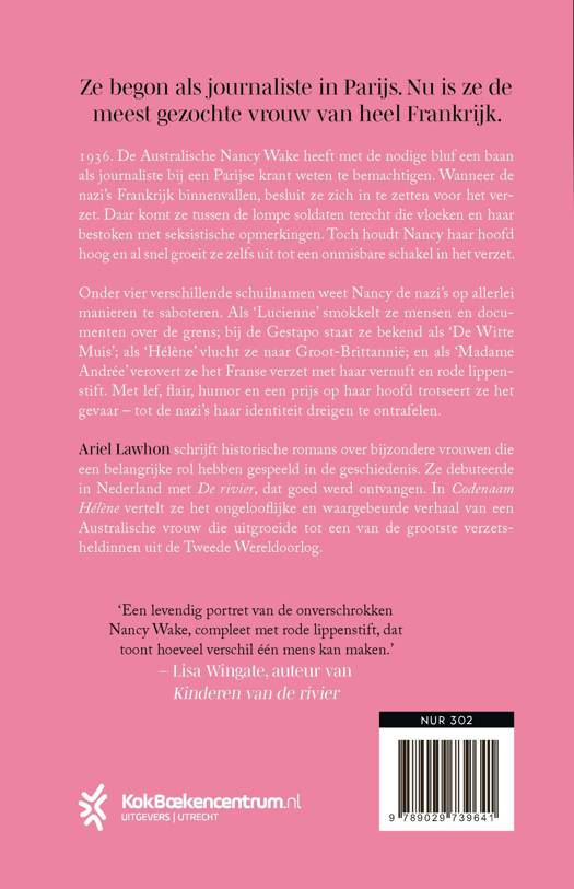 ‘Codenaam Hélène’ van Ariel Lawhon is een spannende, aangrijpende oorlogsroman over een van de grootste verzetsheldinnen uit de Tweede Wereldoorlog. Met krachtige pennenstreken beschrijft Lawhon het betoverende en bij vlagen ontroerende verhaal van Nancy Wake, een Australische journaliste die in de jaren ’30 voor het Franse verzet gaat werken. Daar komt ze tussen de lompe soldaten terecht die haar bestoken met seksistische opmerkingen – maar Nancy houdt haar hoofd hoog en groeit al snel uit tot een onmisbare schakel in het verzet.
