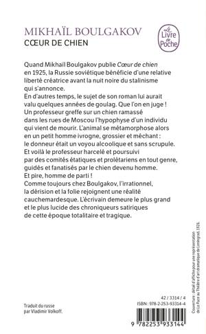 Quand Mikhaïl Boulgakov publie Coeur de chien en 1925, la Russie soviétique bénéficie d'une relative liberté créatrice avant la nuit noire du stalinisme qui s'annonce. En d'autres temps le sujet de son roman lui aurait valu quelques années de goulag. Que l'on en juge ! Un professeur greffe sur un chien ramassé dans les rues de Moscou l'hypophyse d'un individu qui vient de mourir. L'animal se métamorphose alors en un petit homme ivrogne, grossier et méchant: le donneur était un voyou alcoolique et sans scrupule. Et voilà le professeur harcelé et poursuivi par des comités étatiques et prolétariens en tout genre, guidés et fanatisés par le chien devenu homme. Et pire, homme de parti ! Comme toujours chez Boulgakov, l'irrationnel, la dérision et la folie rejoignent une réalité cauchemardesque. L'écrivain demeure le plus grand et le plus lucide des chroniqueurs satiriques de cette époque totalitaire et tragique. Traduction nouvelle de Vladimir Volkoff.