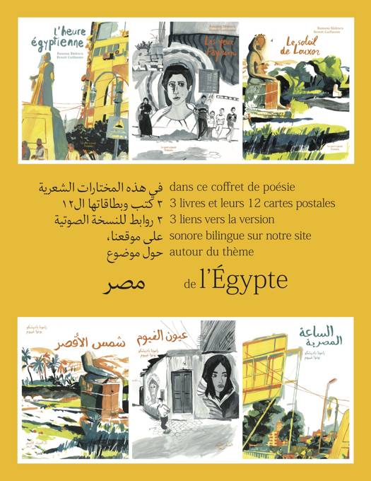 Dans ce joli coffret dédié à L'ÉGYPTE, on retrouve les trois titres de la trilogie égyptienne de Ramona Badescu et Benoît Guillaume, dans la collection Poèmes du Port a jauni : • L'HEURE ÉGYPTIENNE, un voyage du bord du Nil au Caire jusqu'aux bords de la Méditerranée à Alexandrie • LES YEUX FAYOUM, consacré aux portraits du Fayoum qui traversent le temps • LE SOLEIL DE LOUXOR, pour finir le voyage dans le temps et l'espace auprès des pharaons, accompagnés de 12 magnifiques cartes postales issues des livres et des liens QR code vers les versions sonores bilingues en français et arabe disponibles sur notre site : un cadeau idéal !