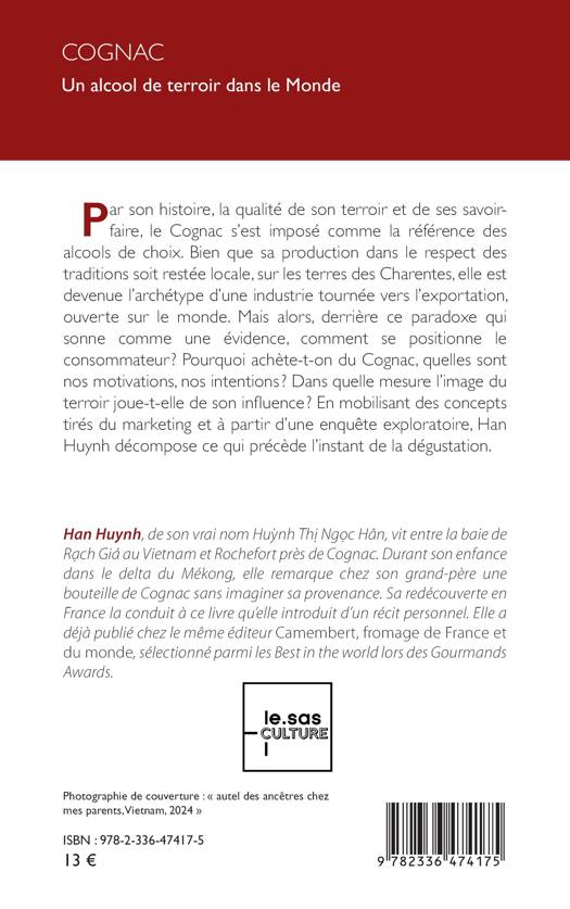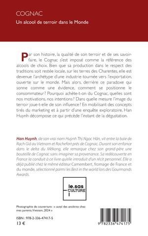Par son histoire, la qualité de son terroir et de ses savoir-faire, le Cognac s'est imposé comme la référence des alcools de choix. Bien que sa production dans le respect des traditions soit restée locale, sur les terres des Charentes, elle est devenue l'archétype d'une industrie tournée vers l'exportation, ouverte sur le monde. Mais alors, derrière ce paradoxe qui sonne comme une évidence, comment se positionne le consommateur ? Pourquoi achète-t-on du Cognac, quelles sont nos motivations, nos intentions ? Dans quelle mesure l'image du terroir joue-t-elle de son influence ? En mobilisant des concepts tirés du marketing et à partir d'une enquête exploratoire, Han Huynh décompose ce qui précède l'instant de la dégustation.