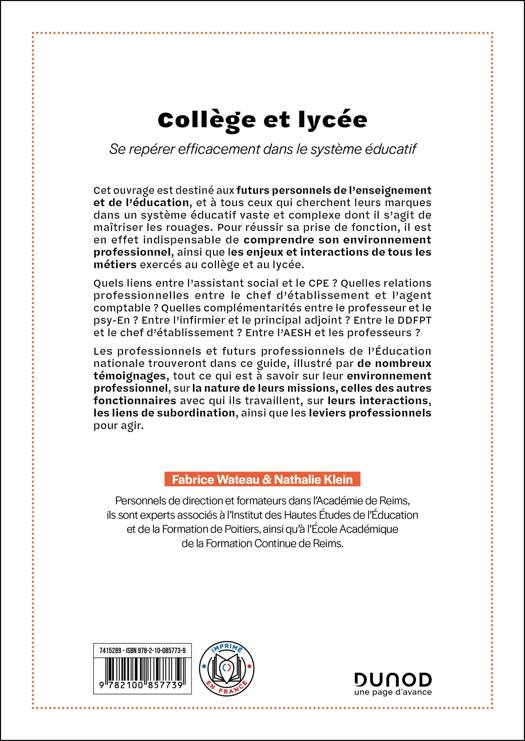 Cet ouvrage est destiné aux futurs personnels de l'enseignement et de l'éducation, et à tous ceux qui cherchent leurs marques dans un système éducatif vaste et complexe dont il s'agit de maîtriser les rouages. Pour réussir sa prise de fonction, il est en effet indispensable de comprendre son environnement professionnel, ainsi que les enjeux et interactions de tous les métiers exercés au collège et au lycée.
