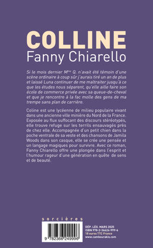 Coline est une lycéenne de milieu populaire vivant dans une ancienne ville minière du Nord de la France. Exposée au flux suffocant des discours stéréotypés, elle trouve refuge sur les terrils ensauvagés près de chez elle. Accompagnée d'un petit chien dans la poche ventrale de sa veste et des chansons de Jamila Woods dans son casque, elle se crée une pensée et un langage magiques pour survivre. Avec ce roman, Fanny Chiarello offre une plongée dans l'esprit et l'humour rageur d'une génération en quête de sens et de beauté.