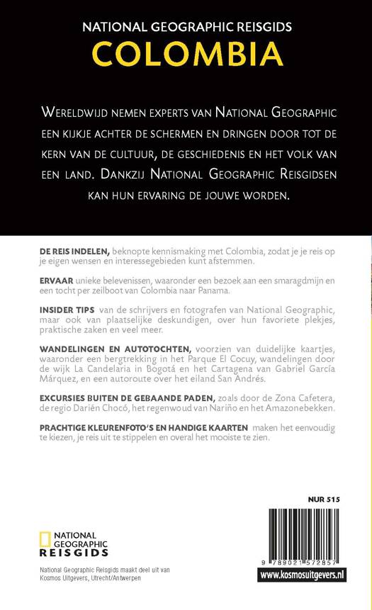 Bezoek met deze National Geographic Reisgids Colombia het regenwoud van Nariño of een smaragdmijn. Maak een tocht per zeilboot van Colombia naar Pananma of maak een wandeling door verschillende wijkjes in Bogotá en het Cartagena van Gabriel García Márquez. Een autoroute over het eiland van San Andrés is ook een aanrader.