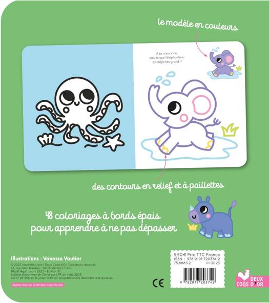 Un cahier proposant 48 dessins à bords épais pour apprendre à colorier sans dépasser ; la moitié avec des bords en relief pailletés ! Thématique : les animaux (chiot, chaton, toucan, panda, crocodile, éléphant, baleine, vache, koala, hérisson, etc.).