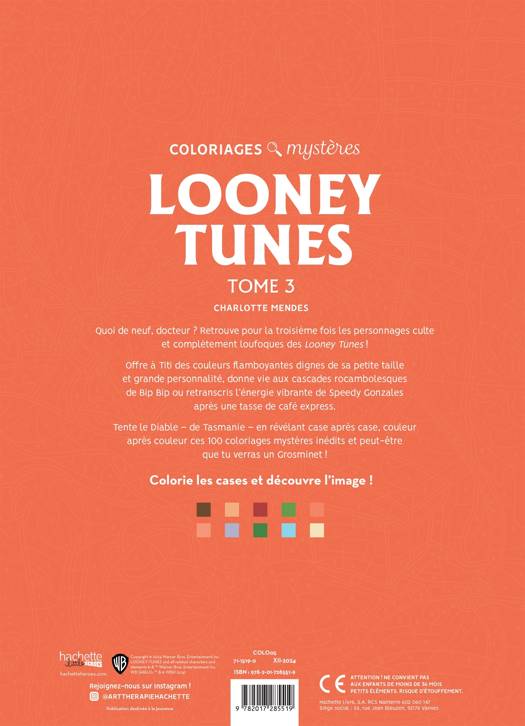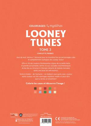 Quoi de neuf, docteur ? Rejoins pour la troisième fois les personnages cultes et complètement loufoques des Looney Tunes ! Offre à Titi des couleurs flamboyantes dignes de sa petite taille et grande personnalité, donne vie aux cascades rocambolesques de Bip Bip ou à l’énergie vibrante de Speedy Gonzales après une tasse de café express. Tente le Diable - de Tasmanie - en révélant case après case, couleur après couleur, ces 100 coloriages mystères inédits. Peut-être même que tu verras un Grosminet !