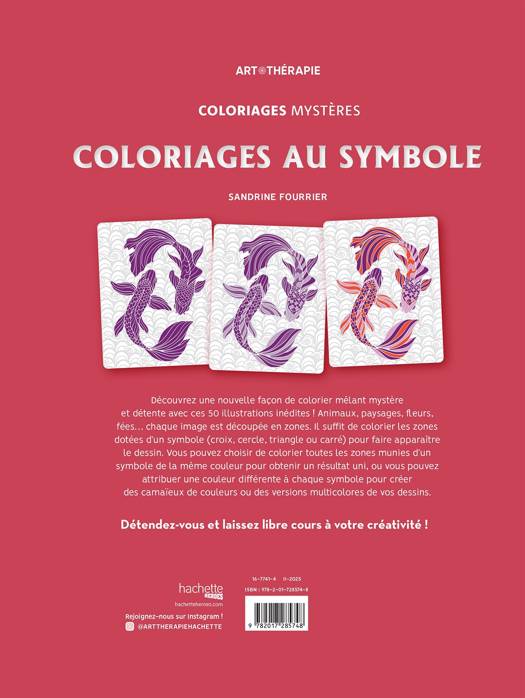 Découvrez une nouvelle façon de colorier mêlant mystère et détente avec ces 50 illustrations inédites ! Animaux, paysages, fleurs, fées… chaque image est découpée en zones. Il suffit de colorier les zones dotées d’un symbole (croix, cercle, triangle ou carré) pour faire apparaître le dessin. Vous pouvez choisir de colorier toutes les zones munies d’un symbole de la même couleur pour obtenir un résultat uni, ou vous pouvez attribuer une couleur différente à chaque symbole pour créer des camaïeux de couleurs ou des versions multicolores de vos dessins.