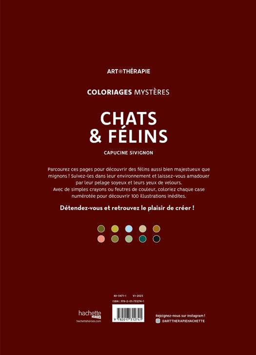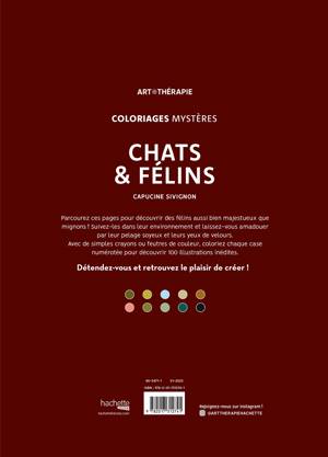 Parcourez ces pages pour découvrir des félins aussi bien majestueux que mignons ! Suivez-les dans leur environnement et laissez-vous amadouer par leur pelage soyeux et leurs yeux de velours. Avec de simples crayons ou feutres de couleur, coloriez chaque case numérotée pour découvrir 100 illustrations inédites.