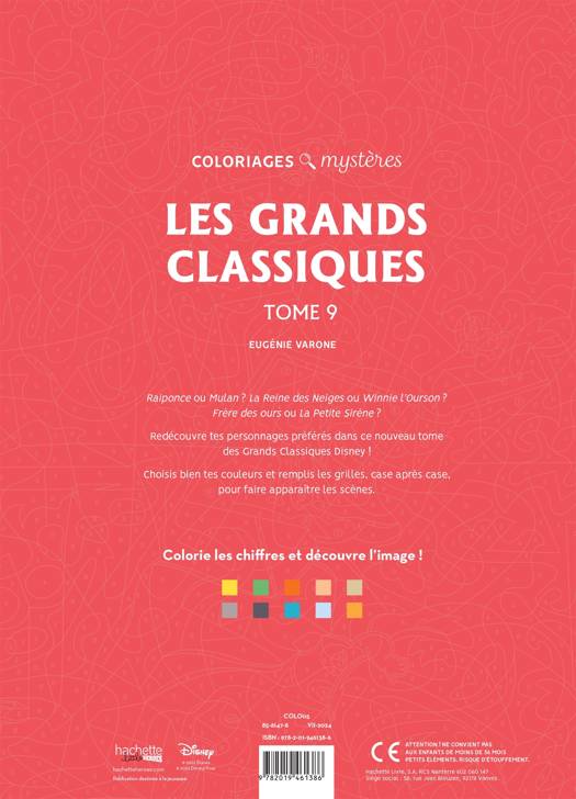 Découvre dans ce neuvième tome des Grands classiques Disney les personnages de tes films préférés ! Grâce aux codes couleurs, applique chaque nuance dans la zone correspondante et révéle la scène représentée !