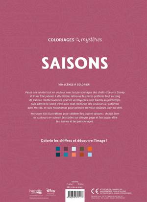 Passe une année tout en couleur avec les personnages des chefs-d’œuvre Disney et Pixar ! De janvier à décembre, retrouve tes héros préférés tout au long de l’année. Redécouvre les prairies verdoyantes avec Bambi au printemps, puis admire le soleil d’été avec Olaf. Ravive les couleurs de l’automne avec Merida, et suis Pocahontas pour peindre en mille couleurs l’air du vent.