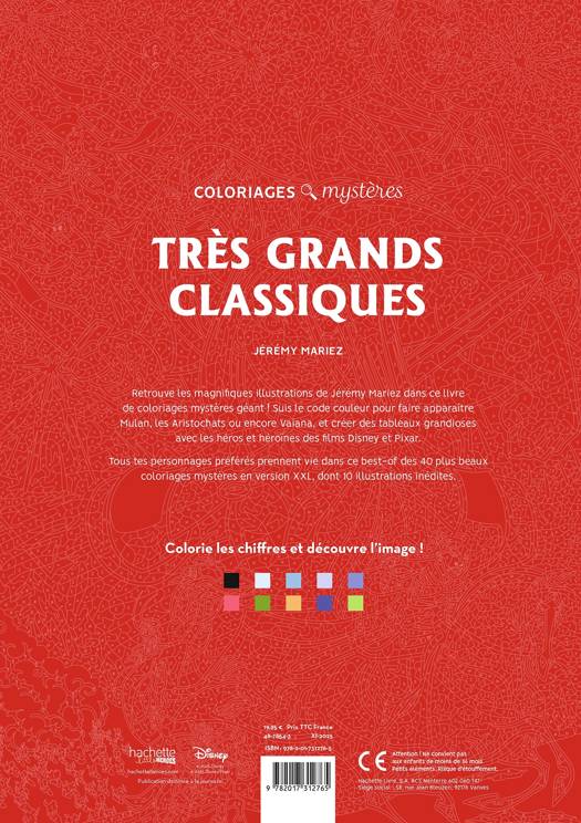 Retrouve les magnifiques illustrations de Jérémy Mariez dans ce livre de coloriages mystères géant (format 28,3 x 40 cm) ! Suis le code couleur pour faire apparaître Vaiana, les Aristochats ou encore Mulan, et crée des tableaux grandioses avec tes personnages Disney et Pixar préférés.
