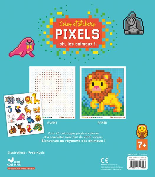 Un cahier de 32 pages proposant 25 coloriages pixels à colorier et à compléter avec 4 planches de stickers. 3 planches de stickers pixels de toutes les couleurs, soit plus de 2000 pixels autocollants + 1 planche d'environ 20 stickers silhouettés représentant des animaux. 4 principes de coloriages : des colos guidés avec petits carrés de couleur ; des dessins à compléter par symétrie horizontale ou verticale ; de grandes scènes illustrées à compléter avec les stickers d'animaux ; 8 coloriages à codes » (1 chiffre = 1 couleur). Les dessins en couleurs sont présentés en fin de cahier. Thématique : les animaux sauvages (de la savane, de la jungle, de montagne, etc.)