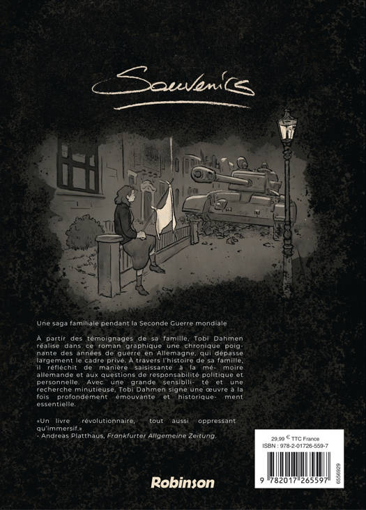 À partir des témoignages de sa famille, Tobi Dahmen réalise dans ce roman graphique une chronique poignante des années de guerre en Allemagne, qui dépasse largement le cadre privé. À travers l’histoire de sa famille, il réfléchit de manière saisissante à la mémoire allemande et aux questions de responsabilité politique et personnelle. Avec une grande sensibilité et une recherche minutieuse, Tobi Dahmen signe une oeuvre à la fois profondément émouvante et historiquement essentielle.