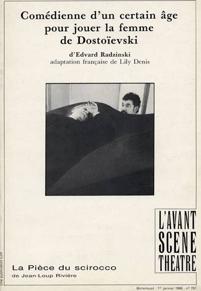Comédienne d'un certain âge pour jouer la femme de Dostoïevski : (Edward Radzinski) Une ancienne comédienne venue se reposer dans une maison de retraite rencontre un pensionnaire fou qui se prend pour Dostoïevski et qui propose à la comédienne d’incarner Fédia Dostoïevski en lisant la correspondance intime du maître et de sa femme...