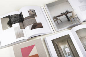 An abstract play of shapes symbolize interior on the cover. On the back of the book, they become a play of lines, embossed in the linnen hardcover, creating a tactile link with the interiors seen inside the book.