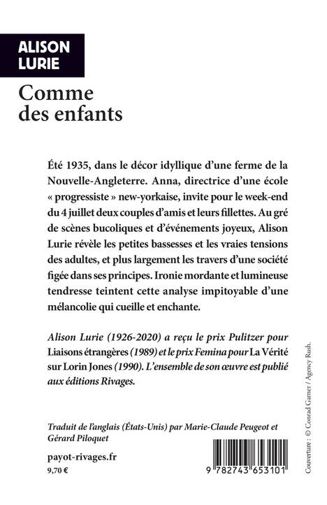 Été 1935, dans le décor idyllique d'une ferme de la Nouvelle-Angleterre. Anna, directrice d'une école « progressiste » en banlieue résidentielle new-yorkaise, invite pour le week-end du 4 juillet deux couples d'amis et leurs fillettes. Au gré de scènes bucoliques et d'événements joyeux, Alison Lurie révèle les petites bassesses et les vraies tensions des adultes, et plus largement les travers d'une société figée dans ses principes. Au bout du compte, ce sont les parents qui, par leurs mensonges, se comportent « comme des enfants ». Ironie mordante et lumineuse tendresse teintent cette analyse mordante d'une mélancolie qui cueille et enchante.