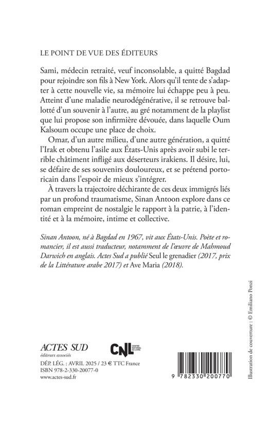 Sami, médecin retraité, veuf inconsolable, a quitté Bagdad pour rejoindre son fils à New York. Alors qu'il tente de s'adapter à cette nouvelle vie, sa mémoire lui échappe peu à peu. Atteint d'une maladie neurodégénérative, il se retrouve ballotté d'un souvenir à l'autre, au gré notamment de la playlist que lui propose son infirmière dévouée, dans laquelle Oum Kalsoum occupe une place de choix. Omar, d'un autre milieu, d'une autre génération, a quitté l'Irak et obtenu l'asile aux États-Unis après avoir subi le terrible châtiment infligé aux déserteurs irakiens. Il désire, lui, se défaire de ses souvenirs douloureux, et se prétend portoricain dans l'espoir de mieux s'intégrer. À travers la trajectoire déchirante de ces deux immigrés liés par un profond traumatisme, Sinan Antoon explore dans ce roman empreint de nostalgie le rapport à la patrie, à l'identité et à la mémoire, intime et collective.